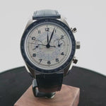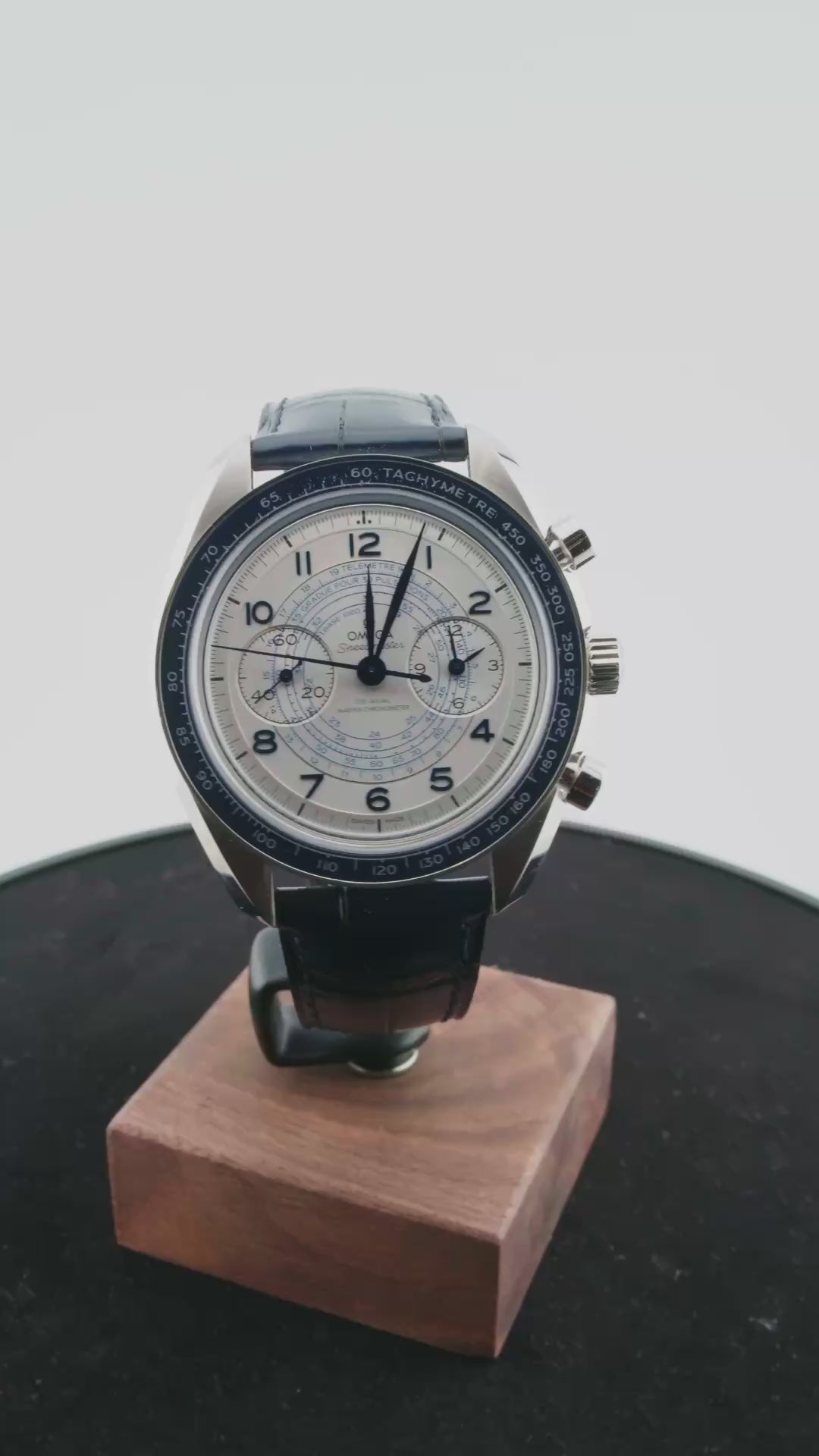 Srebrzysta lub niebieska tarcza to prawdziwy pokaz zegarmistrzowskiego kunsztu. Znajdziemy na niej rozbudowane skale tachymetru, telemetru i pulsometru, inspirowane dawnymi zegarkami lekarskimi i wojskowymi. Subtelne wskazówki, precyzyjna typografia i harmonijny układ subtarcz nadają całości wyraźnie retro charakter. Zegarek osadzony jest na skórzanym pasku, który wprowadza ciepło i podkreśla vintage’owy styl modelu.